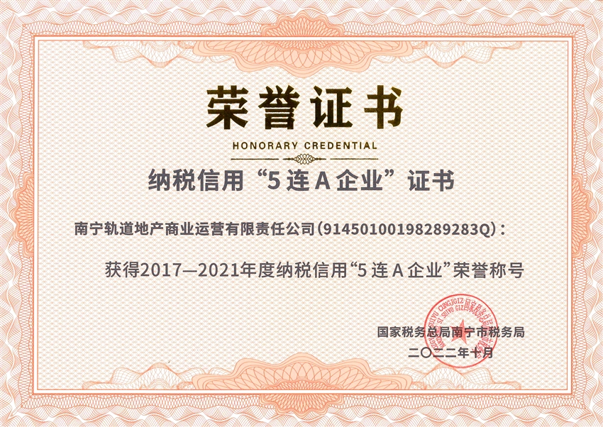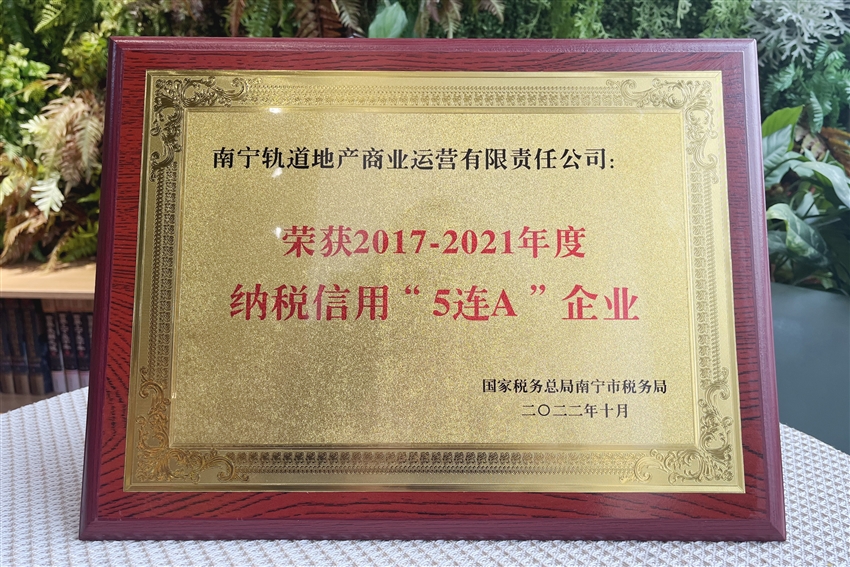 近日,軌道地產(chǎn)商業(yè)公司榮獲國家稅務(wù)總局南寧市稅務(wù)局授予的納稅信用“5連A”企業(yè)榮譽稱號。獲此殊榮,不僅是稅務(wù)機關(guān)對軌道地產(chǎn)商業(yè)公司稅務(wù)管理工作的充分肯定,更為軌道地產(chǎn)商業(yè)公司走上高質(zhì)量發(fā)展之路提供了強有力的支撐。