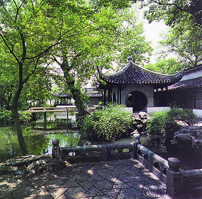 拙政園始建于明正德四年(公元1509年)。它雖經(jīng)過幾百年的蒼桑變遷,但這里處處山水明秀,廳榭典雅,花木繁茂,漫步在其中,你仍能感受到其平淡疏朗、曠遠(yuǎn)明瑟的明代氣息,游過全園,給我印象最深的是位于中部花園的最東面的"梧竹幽居",這里造型非常別致,四個(gè)大大的圓洞門使人馬上聯(lián)想起八月十五晚上的月亮。而更神奇的是如果你站在亭子里向外看,這四個(gè)圓洞門又恰似四個(gè)巨大的鏡框,鑲嵌著蘇州園林一年四季的風(fēng)光。